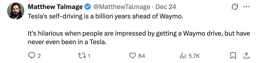 这一表态,被部分人解读为:特斯拉FSD仍略逊于Waymo。