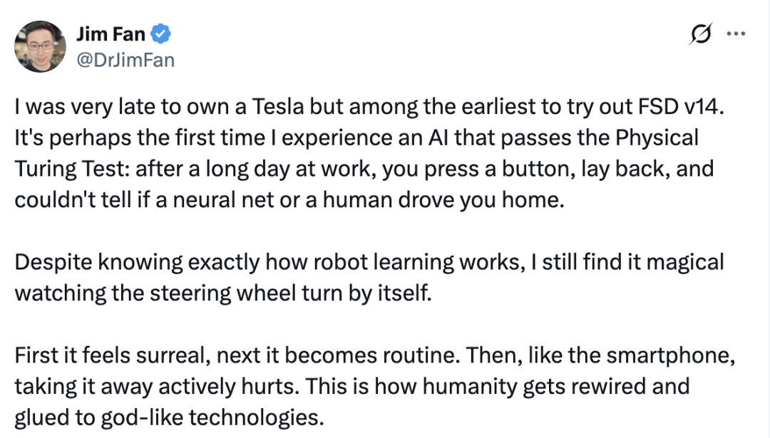 平安夜前夕,这位英伟达Project GR00T的领军人物,在亲眼看到自家特斯拉的一路自主护送自己回家后,大受震撼: