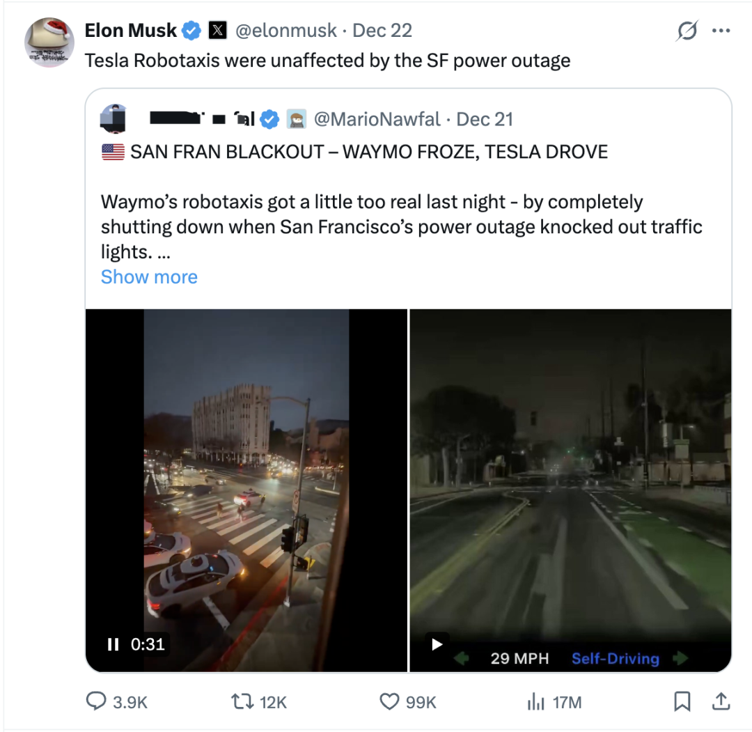 值得一提的是,在前段时间旧金山停电事件中,马斯克还贴脸开大嘲讽Waymo。