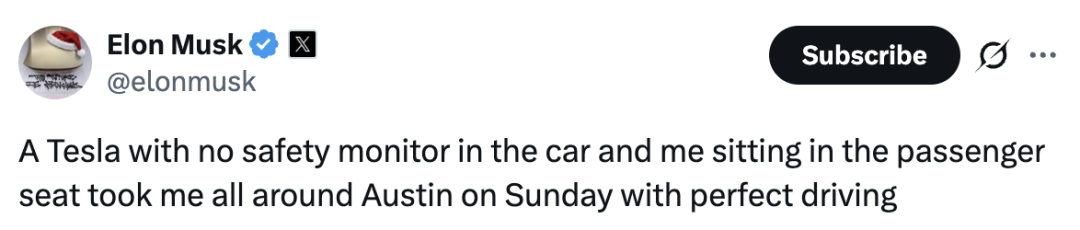 当晚,他在社交平台发文称,自己亲自体验了一次无安全员的Robotaxi测试,并直言体验近乎「完美」。