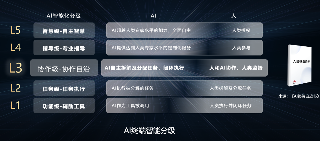 演讲中,贾永利重点提到了终端智能化L1~L5分级标准——来自华为与清华大学人工智能产业院(AIR)联合编写的《AI终端白皮书》。