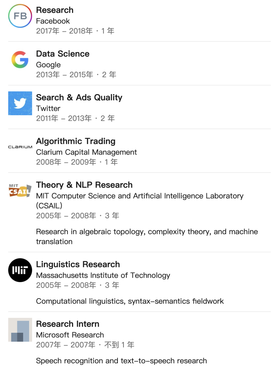 大学毕业后,Edwin先后进入Twitter、Google和Facebook工作,担任机器学习工程师或数据科学家。