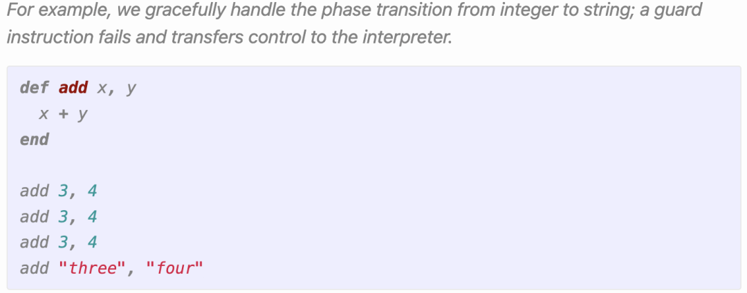 它会基于当前类型稳定的假设生成单一且激进优化的机器码,一旦运行时检测到变量类型不再符合预期(例如整数变为字符串),程序会立即触发侧向退出,终止当前优化代码的执行并安全回退到解释器。
