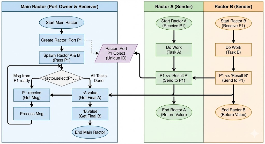 首先是消息的定向投递与安全性。通过Ractor::Port,消息不再是广播式的混乱投递,而是精准地发送到指定的端口。这彻底杜绝了“消息窃取”现象,即A模块发送的消息意外被B模块的接收函数截获。