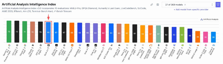 在全球知名的权威大模型评测榜单Artificial Analysis Intelligence Index(AA智能指数)中,GLM-4.7以68分综合成绩荣登开源模型与国产模型双料榜首。