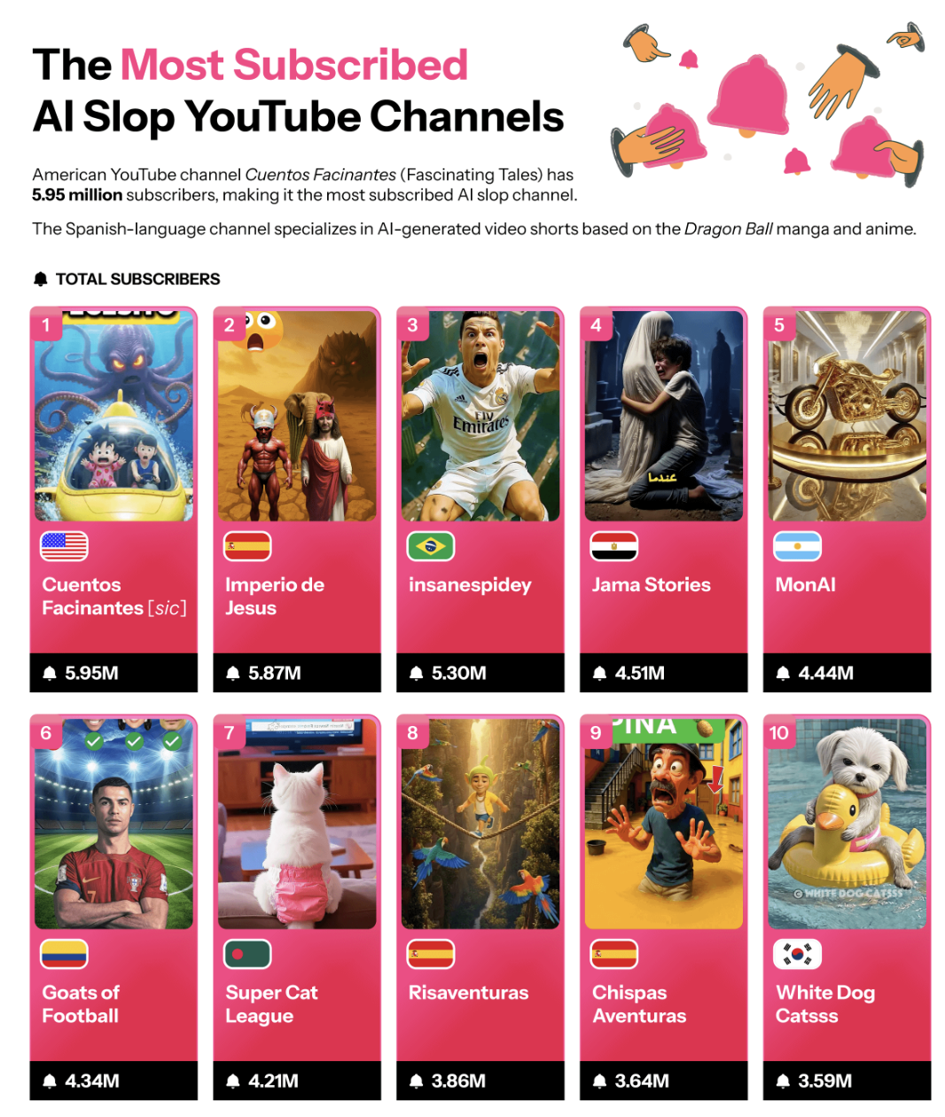 他们得出的结论和Kapwing差不多,发现YouTube增长最快的频道中近10%是AI生成的低质量视频,哪怕平台已经尽力遏制AI内容了,仍累计观看次数数百万。