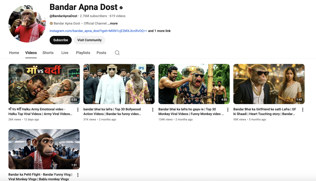 相关研究发现,在调查样本中,一个叫Bandar Apna Dost的高观看量频道累计播放量高达24亿次。