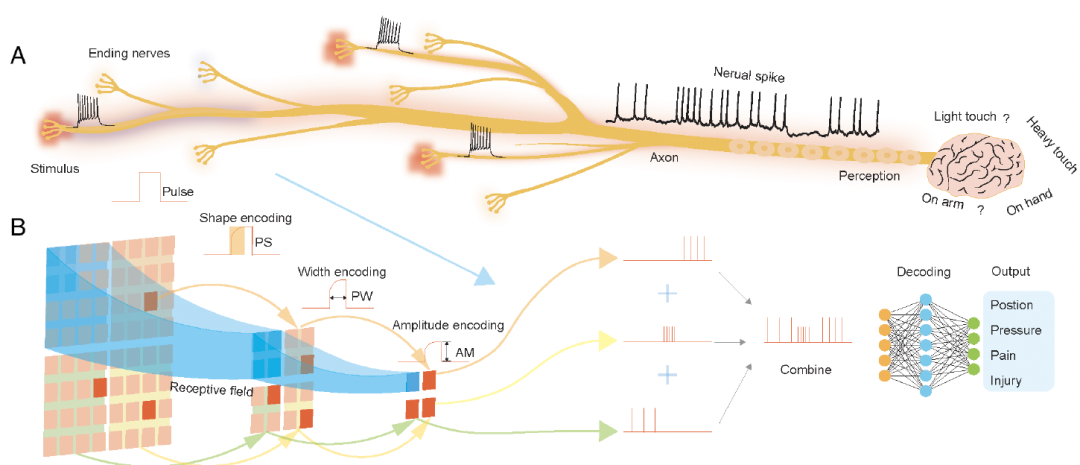 它位于传感层之下,负责将压力刺激转换为脉冲序列,并通过一套模拟生物感觉处理机制的人工感受野网络对信号进行初步处理,实现渐进降维和数据流简化。