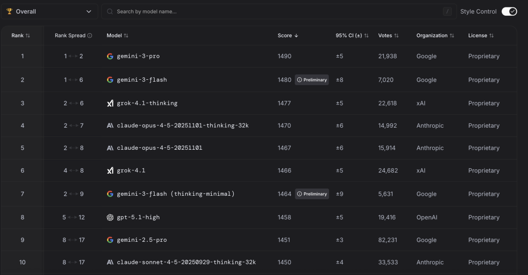 就这样,LMArena成了各家新模型“出道”时的必测榜单。当前Gemini 3 Pro以1490分位居榜首。