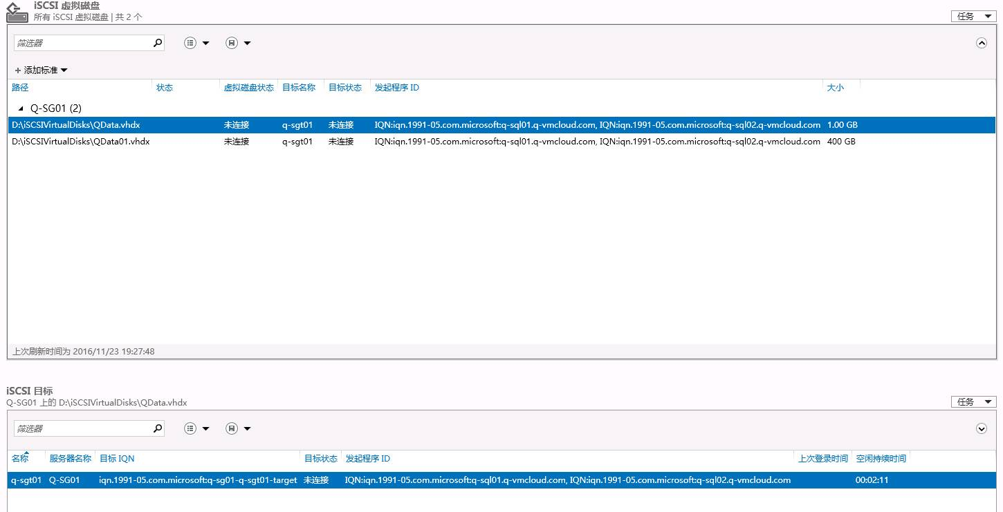 使用同样的方式将 SQL02 也连接到 iscsi 磁盘上,接着确认磁盘管理里是否存在用 iscsi 连接的磁盘:
