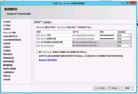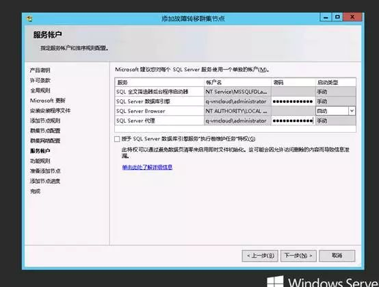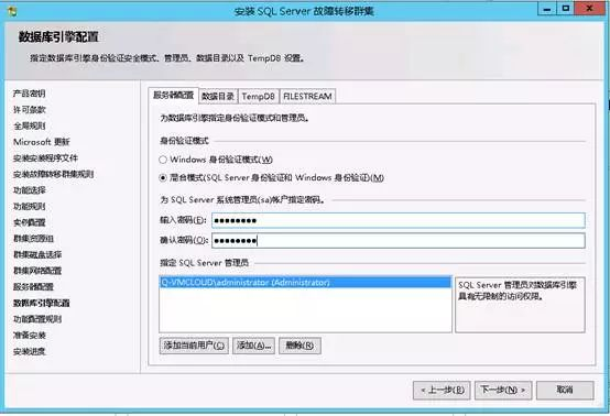 配置管理账户(这里选定域管理,后面再添加 SQLAdmin 作为管理账户,建议生产环境直接使用 SQLAdmin 域账户作为管理账户)