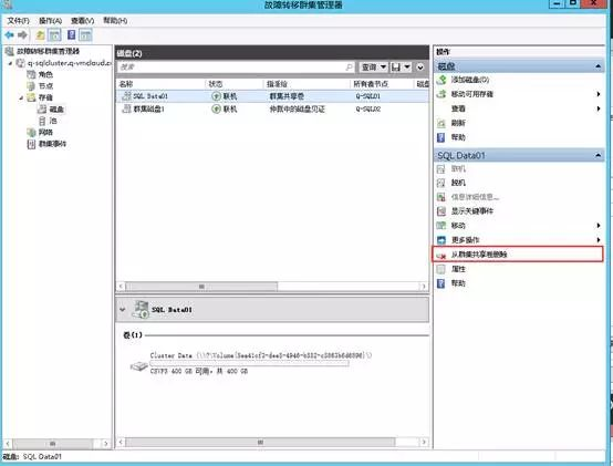 点击群集管理器将 SQLData01 进行脱机删除(上一篇主要为了测试将共享存储进行转换成 CSV 测试转移):