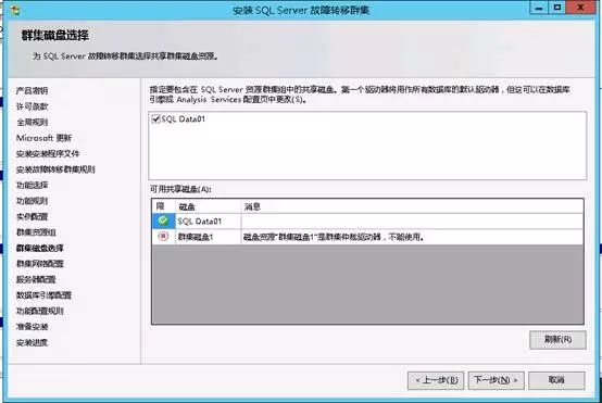 在群集磁盘页面选择 SQL Data01 作为 SQLCluster 共享存储:
