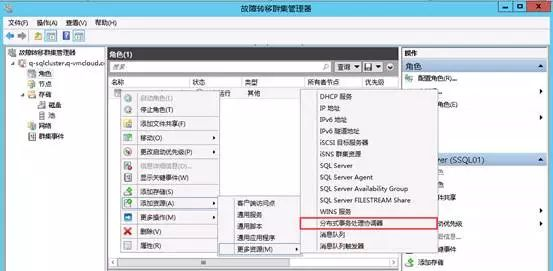 完成第一个节点的创建后,打开群集管理器,点击角色——选中 SQL Server 右键——选择添加资源——分布式事务处理协调器来添加 DTC 进行事务处理: