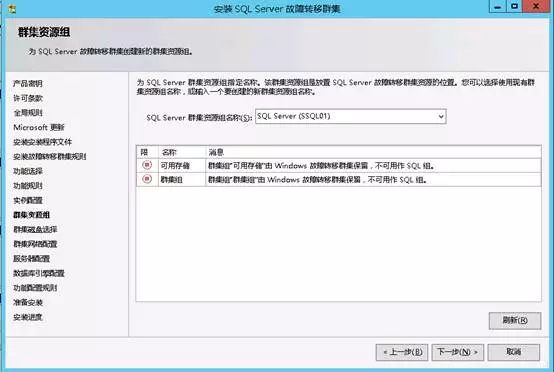 在检查群集资源页上下一步(由于存在仲裁盘及默认 cluster 这里的 SQL 组不可用是正常的):