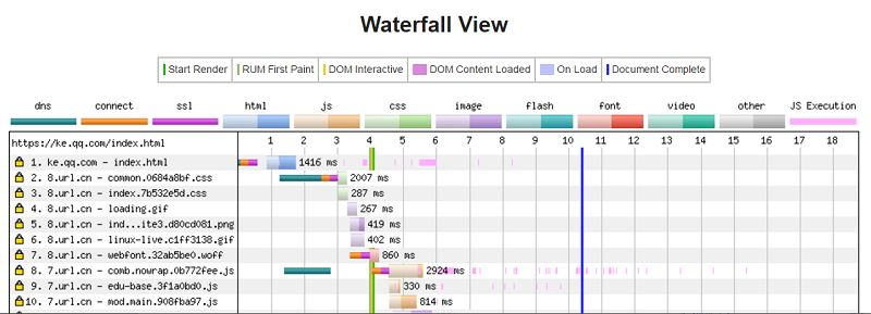 在介绍Server Push功能之前,先来分析网站的加载过程。图1是腾讯课堂(https://ke.qq.com/index.html)的时间瀑布图。