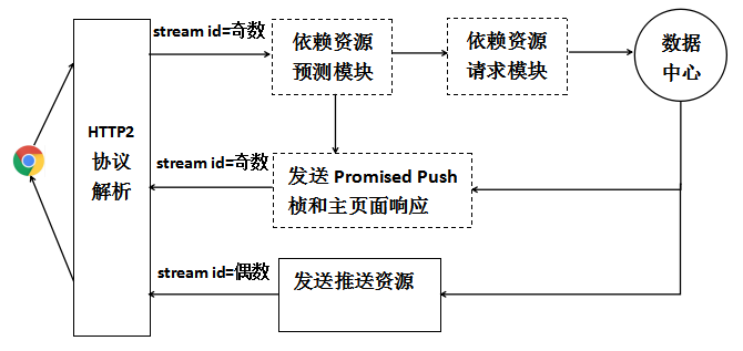 c) 依赖资源请求模块构造和主请求一样的请求信息,在本地或后端服务器请求推送资源,并主动创建新的HTTP/2请求流,后续服务器就可以发送资源响应,推送资源响应在服务端创建的流上传输,主页面响应在原始流传输。