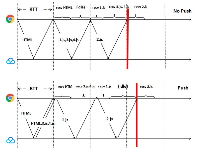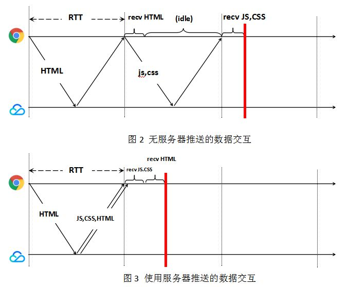 图3说明了若采用服务端推送的功能,则JS/CSS资源基本可以和HTML资源同步到达,浏览器可以“无延时”获取JS/CSS资源,客户端的延时最多可以减少一个RTT。
