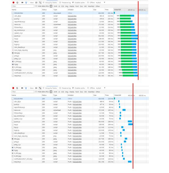 按照前面描述的推送适用场景,用这个腾讯新闻页面(https://news.qq.com/a/20171031/032143.htm)做测试。主请求页面大小为11.6K。可以看出,预先推送js、css、图片等资源给客户端带来的网站性能变快。