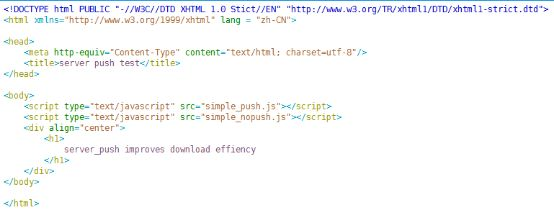 构建一个简单的例子来验证我们的说法。图4所示为simple_push.html代码,页面依赖资源simple_push.js和simple_nopush.js, 页面大小均不超过1KB,主要时间消耗在传输延时。如图5所示为推送simple_push.js和不推送simple_nopush.js的效果对比。