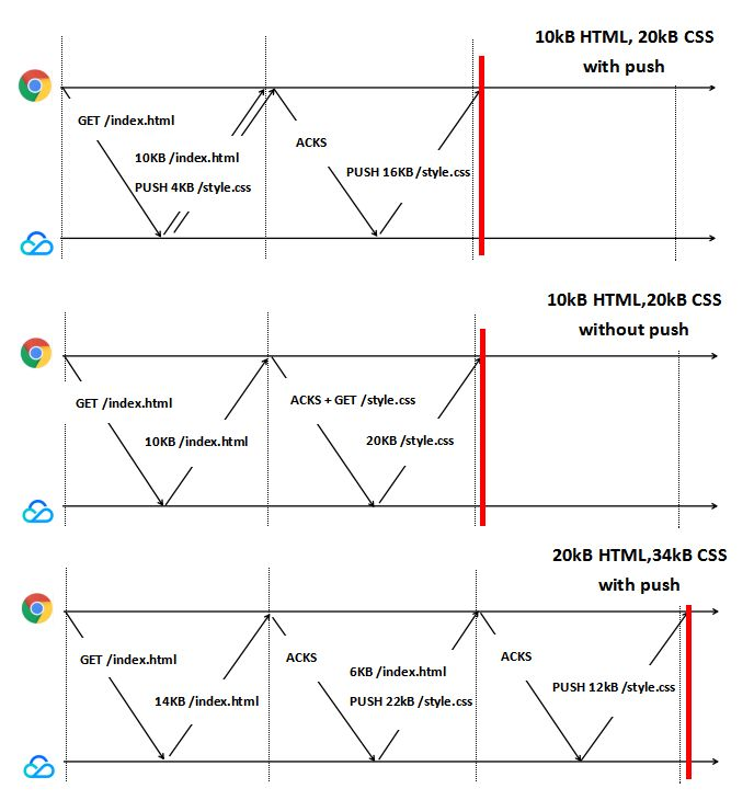 对比图9中子图1和子图2,子图1虽然预推送了/style.css,但是第一次RTT只传输了/style.css的4KB数据,剩下的16KB在第2个RTT完成。子图1总共需要2个RTT的时间,和子图2没有进行推送用了同样多的时间。子图3使用了3RTT完成了整个网站的传输,这会比没有推送使用更多的时间。
