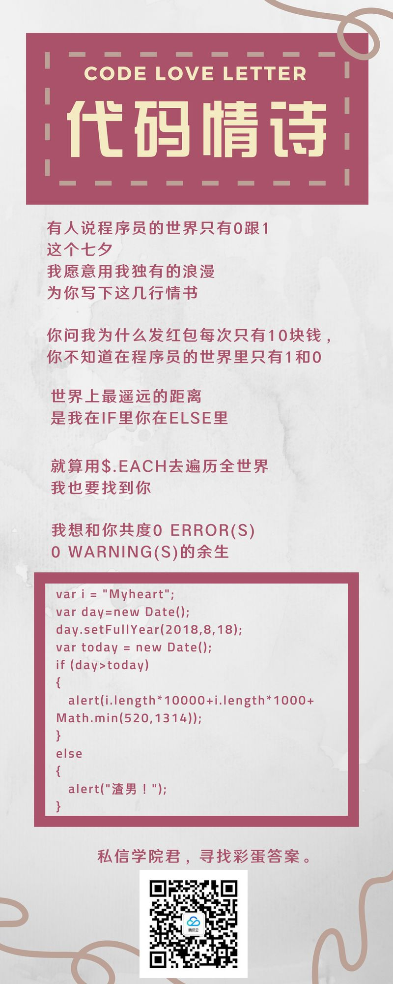 腾小云再给大家介绍学院君,今天七夕,你是个浪漫的程序员吗?学院君给大家准备了【代码情诗】,添加好友查看彩蛋吧!