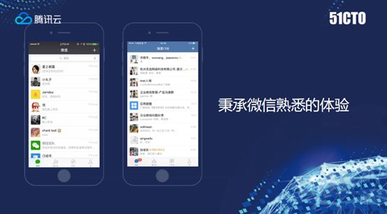 所以企业微信是从微信生态里面剥离出来,做企业的专属连接器,讲到这可能稍微有一些抽象,后面讲的轻松一点,我们看看企业微信到底长的是什么样子。首先给企业微信介绍一下,它是像微信一样,在应用程序商店上可以免费下载的一款独立的软件。图中黑色底色的截图是大家最熟悉的,每人手机上都有的微信,这个蓝色底色的就是企业微信,可以看到布局结构,跟微信如出一辙,如果使用的话,就会知道操作和各种交互体验完全一致,没有切换的成本。所以秉承微信所有熟悉交互体验,带来什么好处?用过微信的人很容易上手用企业微信,后面在案例里面会提到,不需要培训成本。