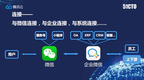 讲完前面这几个连接能力,刚开场的问题应该有一点点答案了,企业微信是什么样的东西,我觉得不止是IM,不止是内部沟通,可能会是一个链条,从企业微信端员工之间沟通,上下游企业供应链管理,到内部企业所有的协同办公系统,再到微信侧广大的10亿月活用户,或者通过服务号、小程序,触达每个用户。这个部分打穿了之后可能会是个链条,真实的世界里,可能会是一张网,这就是企业微信能做到的。