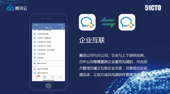除了企业微信跟个人微信互联,还能实现企业和企业之间的互联。我们看到左边这个图,腾讯下面除了自己的各个部门的组织架构之外,还有腾讯合作伙伴,比如腾讯与阅文集团、腾讯与滴滴打车。这个互联给大家一个机会,可以在一定的权限范围之内,公布一部分组织架构或者人员公开给对方企业,方便企业与企业之间沟通,甚至是一些信息系统的对接,前面讲到有信息流,有审批流,还有资金流,在企业之间的交互中也可以容纳在一起。