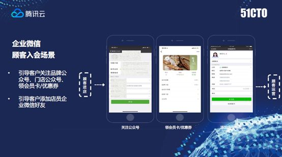 刚才讲销售人员的推送,这下面是一个反过来的场景。这是关注了公众号或者加入了群,在这个中间需要做运营,你通过各种活动,比如会员卡、优惠券等方式可以有机会逐步增加粘性并优选出高质量用户,然后添加销售人员等企业微信为好友,这个在营销概念里面是一个漏斗,从一个群的运营到逐步缩小范围,到一对一或者一对多方式,最后在后面可以有机会对接内部系统。
