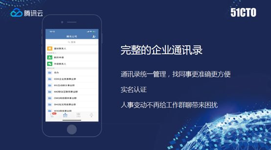 看一下这几个小的功能,刚才讲通讯录,这里是腾讯内部通讯录,这是总的组织架构,是以HR的标准将组织架构通讯录灌进这个企业微信里面,所有里面的成员都是实名制,都是真名,你在沟通之中都很容易识别。如果离职了,T+0或者T+1天,从HR角度,当你退还资产,退还门禁卡,所有这些群都可以自动退出,不用考虑清理了。当然新员工进来也是一样。