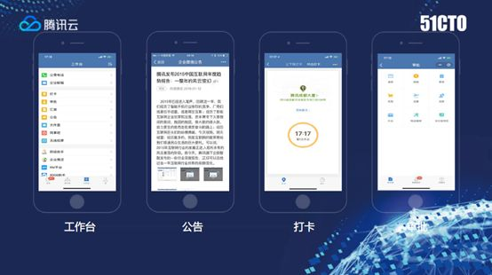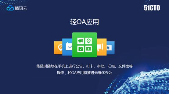 刚才谈到企业微信后台可以对接系统,其中就包括企业的OA系统。企业微信在这个平台上做了一些轻OA应用,为什么是轻OA,是因为我们面临很多大型企业,其实在多年IT系统发展过程中已经建设沉淀了很多自己的系统,比如刚才提到银行金融行业、政府机关医疗机构等等。客户并不一定需要替换系统,只是需要通过标准接口把原有的OA系统对接过来。这是企业微信的产品设计理念,秉承腾讯开放的态度,采用标准接口,鼓励生态的发展。