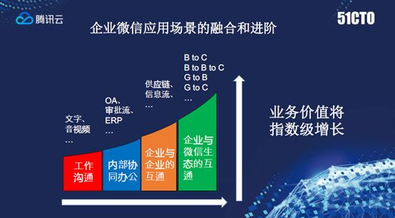 如果能达到企业和企业互联,能做到信息流、审批流、资金链、供应链协同。再多加上企业微信跟个人微信打通,可以实现更为丰富的场景,比如B2B,B2B2C,G2B,就是政府对企业,或者G2C,有很多想象空间。
