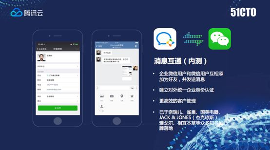 刚才有讲到一个场景,说营销中很多人不喜欢用电话或者短信这种方式,而喜欢通过群的方式营销。如果微信和企业微信对接之后,能形成一对一, 很快也会有一对多的方式营销。企业微信还有支持小程序,可以为营销提供一种可能性,就是千人千店,每个营销员基于自己特定用户画像可以在小程序端选不同SKU编排成自己的店推送给个人微信端的客户,客户在个人微信里可以看到甚至下单交易,在小程序中间也可以加入参数,可以解决营销机构里销售人员的业绩考核和返佣的问题。