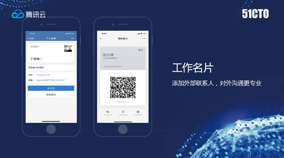到前面为止看到的这些功能,还处在内部沟通和办公。而与微信消息互通,已经在今年4月份开始内测,刚才这位朋友也是加入了内测,所以会提到添加外部好友,这两个图可以看到一个是微信,一个是企业微信,这两个软件APP可以互加好友。加好友方法也和微信一样,可以扫码,在扫码的时候会看到不一样的地方在哪里?从微信侧看到这个企业微信的用户上面多了一段,这段叫做企业信息,如果你的企业经过了认证,这个认证是要拿你企业工商税务相关证据做申请的,每年要刷新认证,会获得一个打勾的认证标识,会得到这一段企业信息,包括职务,企业名称,手机电话、邮箱等等。也可以看到这个企业的工商税务信息,这个带来什么意义?就像我们在商务世界中发名片,名片中的关键信息是姓名、手机号、地址,你这个邮箱地址你会放什么邮箱?一定是后缀是公司地址的邮箱,说明你从这个地址发邮件,对方知道你的身份。第二,只有你的办公邮箱,才有可能接入公司内部系统,像CRM、ERP、排班系统等等。在微信生态里面是类似的,大家看到以前是PC环境办公,现在慢慢从PC环境,转向移动办公了。在微信世界中沟通,企业微信就可以给你身份的背书,同理企业微信有机会跟企业后台系统对接,这个后面想象空间就大了。