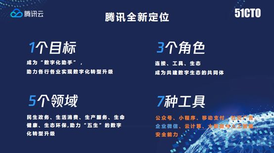 一个目标:腾讯要成为数字化助手。在前面那张图中,腾讯大部分产品是2C产品,在To B方面的经验积累不多。腾讯今年是成立第20年,我们更擅长地方是在于后面的“三个角色“ :能给用户提供连接能力,提供工具,提供生态。我们在To B经验并不是十分丰富情况下做To B转型,我们擅长的是把这些角色做好,做好平台级的工具,成为企业数字化转型的助手。