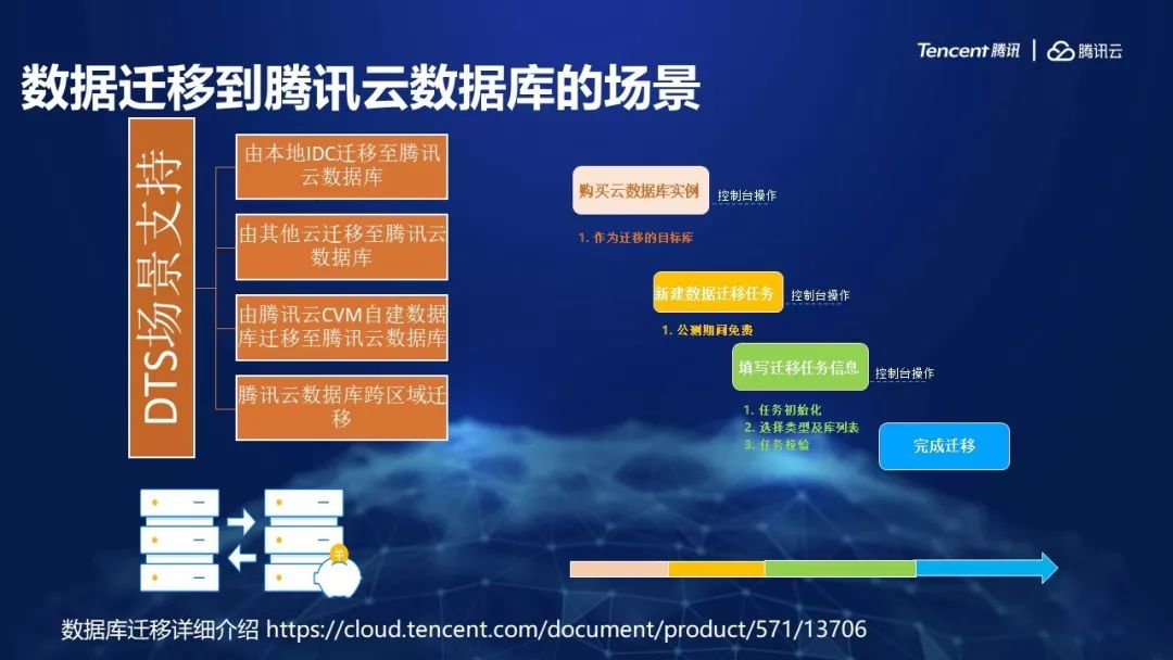 支持不同环境及不同类型的数据库迁移。支持迁移的源库包括有公网IP的外网自建数据库,通过VPN、专线等网络环境接入腾讯云的自建数据库,云服务器CVM自建数据库;目标库为TencentDB for MySQL实例。支持查看所有迁移任务的状态及多任务批量操作。 DTS提供的数据迁移功能是您数据上云的的最佳选择。数据迁移仅需几步设置,则可帮助您完成数据从本地迁移上云的一系列繁琐工作。迁移过程中并不影响源数据库继续对外提供服务,最小化上云过程对您业务的影响。