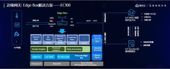 这个是我们关于edge Box的实现,它是一个可扩展的白盒化架构设计。软件层面我们也做了一些定义,主要包括可腾讯的edge kit,实现边缘网关轻量级OS、容器化业务部署、MQTT、IoT数据格式规整等服务。