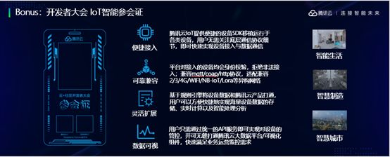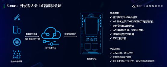 大家可以看到,通过这个开发板,右边是你扫码之后能够互动到现场的场景,一方面能够把你的名字推送到智能参会证上,另一方面现在我们做的比较简单,可以检测到会场环境数据、包括、温度、湿度、PM2.5检测的数据等。大家拿回去可以在上面便捷地开发自己的应用。我们也希望开发板作为这次大会的小礼物,大家带回去,能够感受到腾讯的开放心态,能够希望和开放者拥抱在一起,构筑物联网的万物智联新时代,谢谢。
