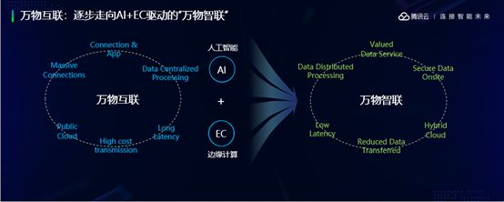 我们认为下一代,物联网发展再进一步的话,在不远的将来,应该是从万物的互联发展到万物的智联。什么叫万物的智联,我大概做了一些分析,万物互联的时代,物联网的价值主要来自于连接、来自于流量,来自于具体的应用,结合AI之后,万物智联更多的价值会从数据分析和挖掘方面体现,我们将从数据应用与分析获取更多的价值。