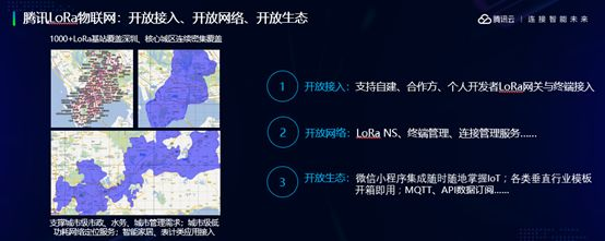 最后,大家非常关注腾讯到底在物联网上面有哪些具体的动作。前面讲到了很多的平台和解决方案,除了这些平台和解决方案以外,我们在物联网基础设施建设方面也做了大量工作。应该是今年Q4,我们在深圳建设了一个全国最大规模的LoRa网络,实现了整个深圳重点区域的连续覆盖。这张网络我们建设完之后我们对它的期望,不止是面向我们的行业用户提供高质量的窄带物联网服务,,我们更希望把它打造成一个开放的物联网网络,支持腾讯自建以及合作方、个人开发者网关和终端应用的开放接入,为开发者提供一个开放的LoRa应用开发环境,促进物联网生态良性发展。