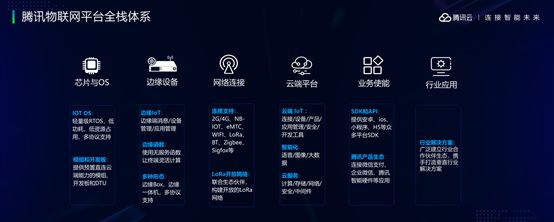 腾讯的物联网体系,是一个全栈解决方案体系,涵盖从操作系统、终端芯片、边缘设备、网络、到云端平台、行业应用等各个方面,是一个完整的体系。