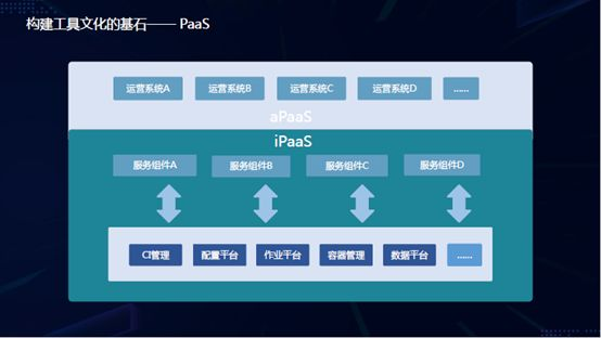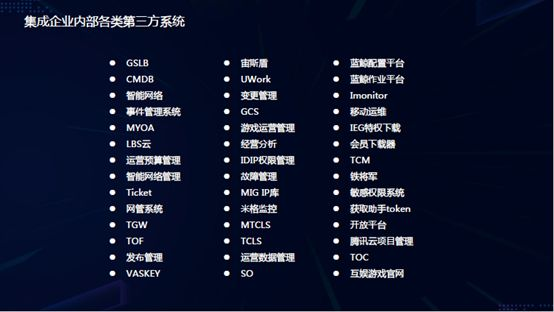 在腾讯内部我们有非常多的部门提供了非常多的平台,我们都会把它对接到PaaS里面,我们把它作为第三方系统,你们以前购买了非常多的商业软件,这个时候你也需要对接进去。当我们把这些平台或者第三方对接以后,我们需要让运维基于PaaS构建工具文化,我们需要把它落地,怎么做?这一块我们讲有一个终极的目标,就是我们要做运维开发,就是运维实际去写这些东西,传统非常多的事情,运维以前可能没有参与,整个这一块我们提供了这样的PaaS。