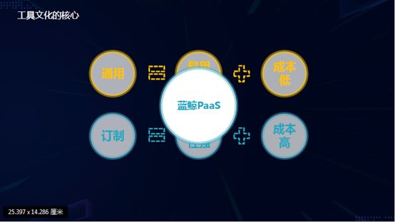 定制本,我给你单独做一个,VIP的贴身服务,你要什么我给你做什么,这种其实是应用性增强的,但是这块成本会很高,因为一万个人要做一万个工具,我们通过PaaS的理念,我们做到了定制和应用性强,而且它成本很低。在这一块,在腾讯内部我们延伸了这样一种工具文化,通过PaaS的理念做了之后,我们可以看一下,这几年跟着腾讯这一块,要扎根互联网,要全面拥抱产业互联网,我们也跟着腾讯云一起对外输出我们的能力,我们会把我们构建的SaaS上线到我们的市场里面去,包括非常多的业务通用的脚本都会输出,你只要去下载一个PaaS,这些SaaS就可以安装下去,就像买一个苹果手机你可以安装APP一样。