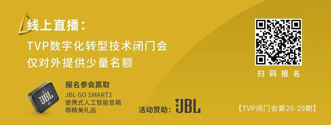 此次“携传统,至未来” TVP 数字化转型技术闭门会采用线上会议形式,限量名额开放。点击文末「阅读原文」或「扫描下方二维码」即可填写表格报名相应专题会议,通过审核后即可成为会议特邀嘉宾,参与讨论。