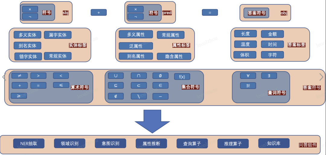 如上图所示,知识问答整个系统包含了语义解析,语义匹配,查询,推理等。拆解成更细的组件来看的话,可以拆解成实体抽取,属性映射,知识表示,知识图谱检索,查询算子等具体不同的能力。