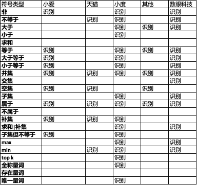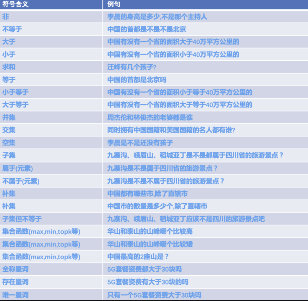 “这个5G套餐资费都大于30块吗”,其元素是指当前这一个“5G套餐资费”。其对应的符号可以对单个元素进行修饰的有:大于,小于,大于等于,小于等于等。