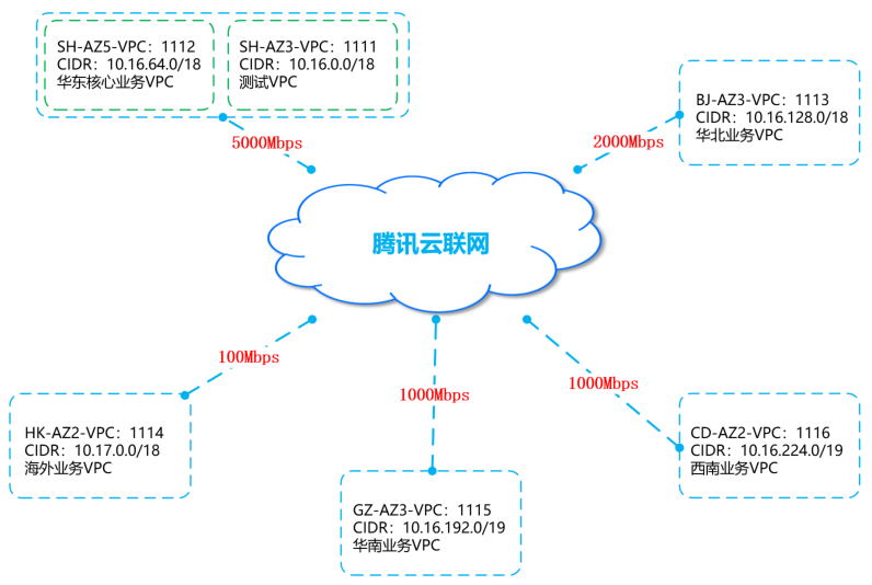 所有存量 VPC 以及后续增量 VPC 互通的流量都需要通过云联网实现,可以将该云联网实例看作企业 A 的虚拟骨干网;