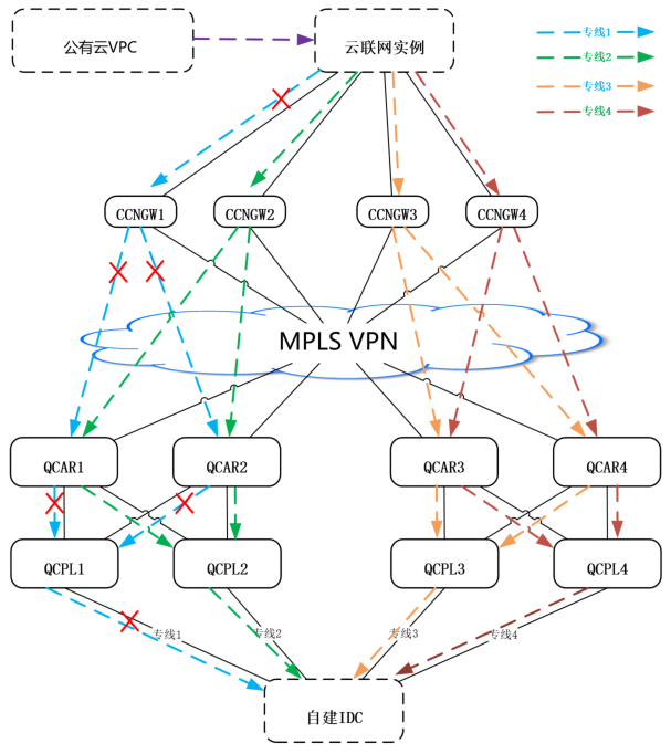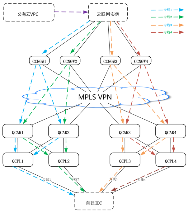 名词解释:CCNGW(云联网类型专线网关)、QCAR(网络设备)、QCPL(网络设备)IDC(数据中心)。