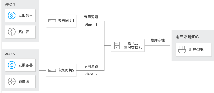 混合云架构前期都是使用传统的专用通道打通用户 IDC 与云上 VPC。如果一根物理专线需要打通多个 VPC,需要通过不同的 VLAN ID 分别创建专用通道来连接多个VPC。